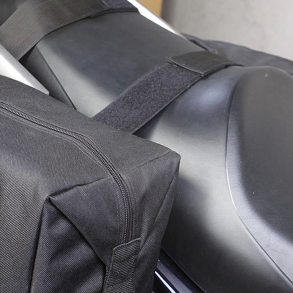 4) Secure inside lower bags to bike using supplied elastic straps and four rings on bag corners – attach to bike frame for added security.